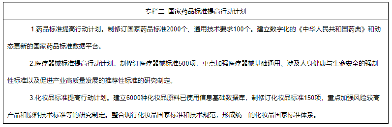 1.持續(xù)推進(jìn)標(biāo)準(zhǔn)體系建設(shè)。繼續(xù)開展國家藥品標(biāo)準(zhǔn)提高行動計劃。編制2025年版《中華人民共和國藥典》。加強(qiáng)標(biāo)準(zhǔn)的國際協(xié)調(diào),牽頭中藥國際標(biāo)準(zhǔn)制定,化學(xué)藥品標(biāo)準(zhǔn)達(dá)到國際先進(jìn)水平,生物制品標(biāo)準(zhǔn)與國際水平保持同步,藥用輔料和藥包材標(biāo)準(zhǔn)緊跟國際標(biāo)準(zhǔn)。加強(qiáng)藥品標(biāo)準(zhǔn)技術(shù)支撐體系建設(shè),提升藥品標(biāo)準(zhǔn)研究能力。優(yōu)化醫(yī)療器械標(biāo)準(zhǔn)體系,鼓勵新興技術(shù)領(lǐng)域推薦性標(biāo)準(zhǔn)制定,加快與國際標(biāo)準(zhǔn)同步立項(xiàng),提升國內(nèi)外標(biāo)準(zhǔn)一致性。完善化妝品標(biāo)準(zhǔn)技術(shù)支撐體系,健全標(biāo)準(zhǔn)制修訂工作機(jī)制。