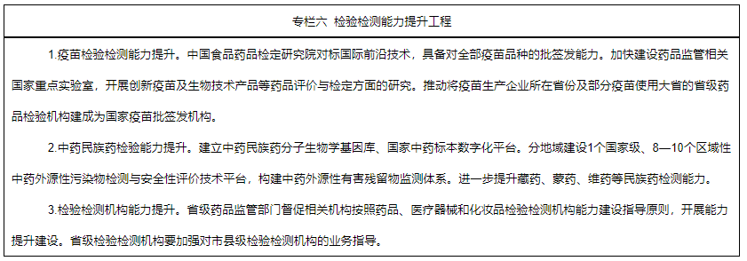 5.加強(qiáng)檢驗(yàn)檢測體系建設(shè)。加強(qiáng)藥品、醫(yī)療器械檢驗(yàn)檢測關(guān)鍵技術(shù)和平臺建設(shè)。以中國食品藥品檢定研究院為龍頭、國家藥監(jiān)局重點(diǎn)實(shí)驗(yàn)室為骨干、省級檢驗(yàn)檢測機(jī)構(gòu)為依托,完善科學(xué)權(quán)威的藥品、醫(yī)療器械和化妝品檢驗(yàn)檢測體系。國家級檢驗(yàn)機(jī)構(gòu)著重瞄準(zhǔn)國際技術(shù)前沿,強(qiáng)化重點(diǎn)專業(yè)領(lǐng)域檢驗(yàn)?zāi)芰ㄔO(shè)。地方各級檢驗(yàn)機(jī)構(gòu)針對日常和應(yīng)急檢驗(yàn)需求,補(bǔ)齊能力短板,力爭具備應(yīng)對突發(fā)公共衛(wèi)生事件“應(yīng)檢盡檢”能力。圍繞藥品關(guān)聯(lián)審評審批及監(jiān)管需要,推動建立布局合理、重點(diǎn)突出的藥用輔料和藥包材檢驗(yàn)檢測體系。