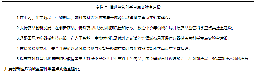 6.深入實(shí)施中國藥品監(jiān)管科學(xué)行動計劃。統(tǒng)籌推進(jìn)監(jiān)管科學(xué)研究基地和重點(diǎn)實(shí)驗(yàn)室建設(shè),開展監(jiān)管科學(xué)等研究。將藥品監(jiān)管科學(xué)研究納入國家相關(guān)科技計劃,重點(diǎn)支持中藥、疫苗、基因藥物、細(xì)胞藥物、人工智能醫(yī)療器械、醫(yī)療器械新材料、化妝品新原料等領(lǐng)域的監(jiān)管科學(xué)研究,加快新產(chǎn)品研發(fā)上市。支持國家審評、檢驗(yàn)、評價、核查等機(jī)構(gòu)參與國家相關(guān)科技項(xiàng)目,鼓勵開展藥品快速檢測新技術(shù)、藥品研發(fā)生產(chǎn)及質(zhì)量控制等研究,開展數(shù)字診療裝備、個體化診療產(chǎn)品、生物醫(yī)用材料的質(zhì)量評價、檢測技術(shù)及檢測規(guī)范等研究,開展化學(xué)藥品、疫苗、新型藥物和特殊藥物劑型等安全性、有效性評價技術(shù)以及創(chuàng)新醫(yī)療器械標(biāo)準(zhǔn)體系研究。鼓勵運(yùn)用現(xiàn)代科學(xué)技術(shù),結(jié)合我國傳統(tǒng)優(yōu)勢項(xiàng)目和特色植物資源,加強(qiáng)化妝品新原料研究。