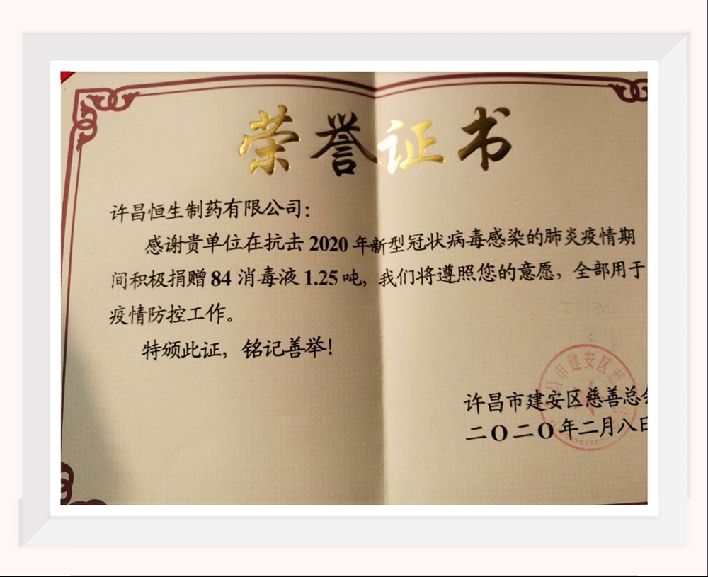 在得知相關防疫物資需求量不斷上升,各項物資處于緊缺的情況下,許昌恒生制藥有限公司第一時間通過許昌市建安區慈善總會捐贈84消毒液1.25噸,全部用于疫情防控工作。