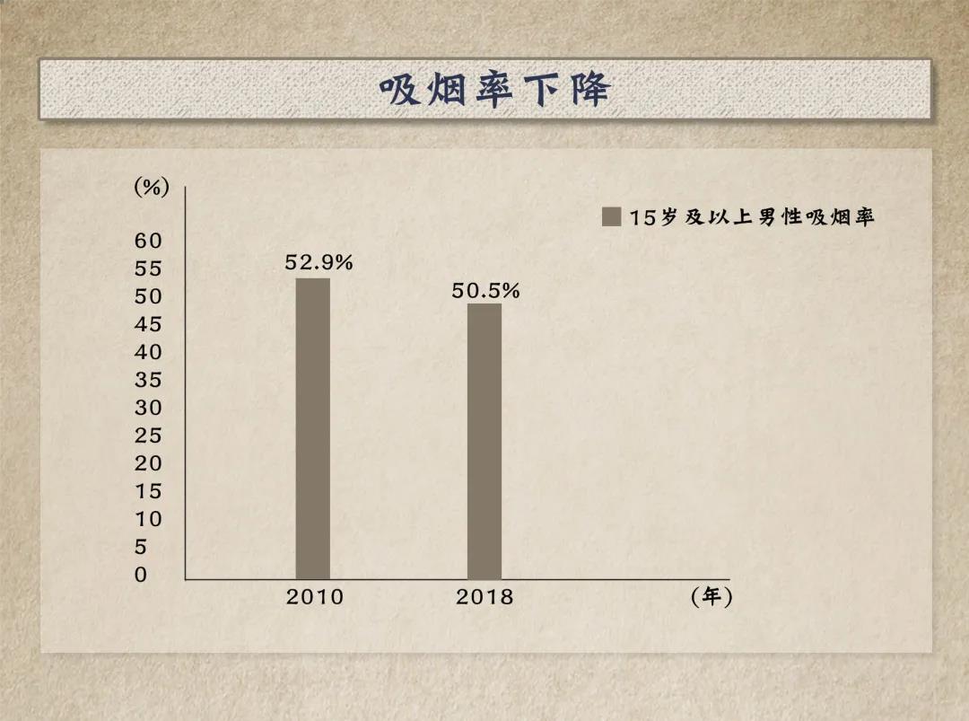 2010年至2018年,中國15歲及以上人群吸煙率呈下降趨勢,其中男性從52.9%降至50.5%。2018年,86.0%的人認(rèn)為吸煙會(huì)引起嚴(yán)重疾病。